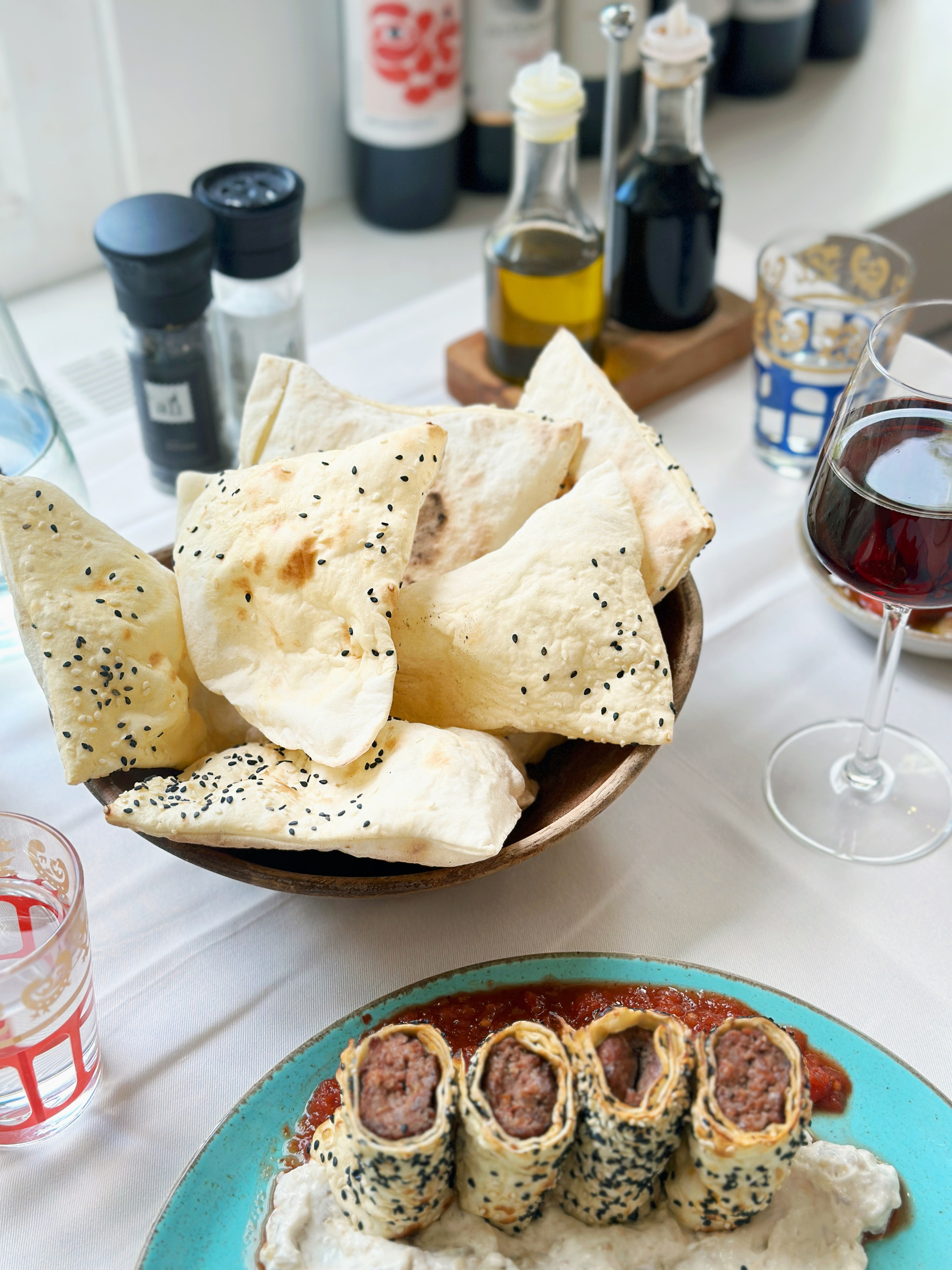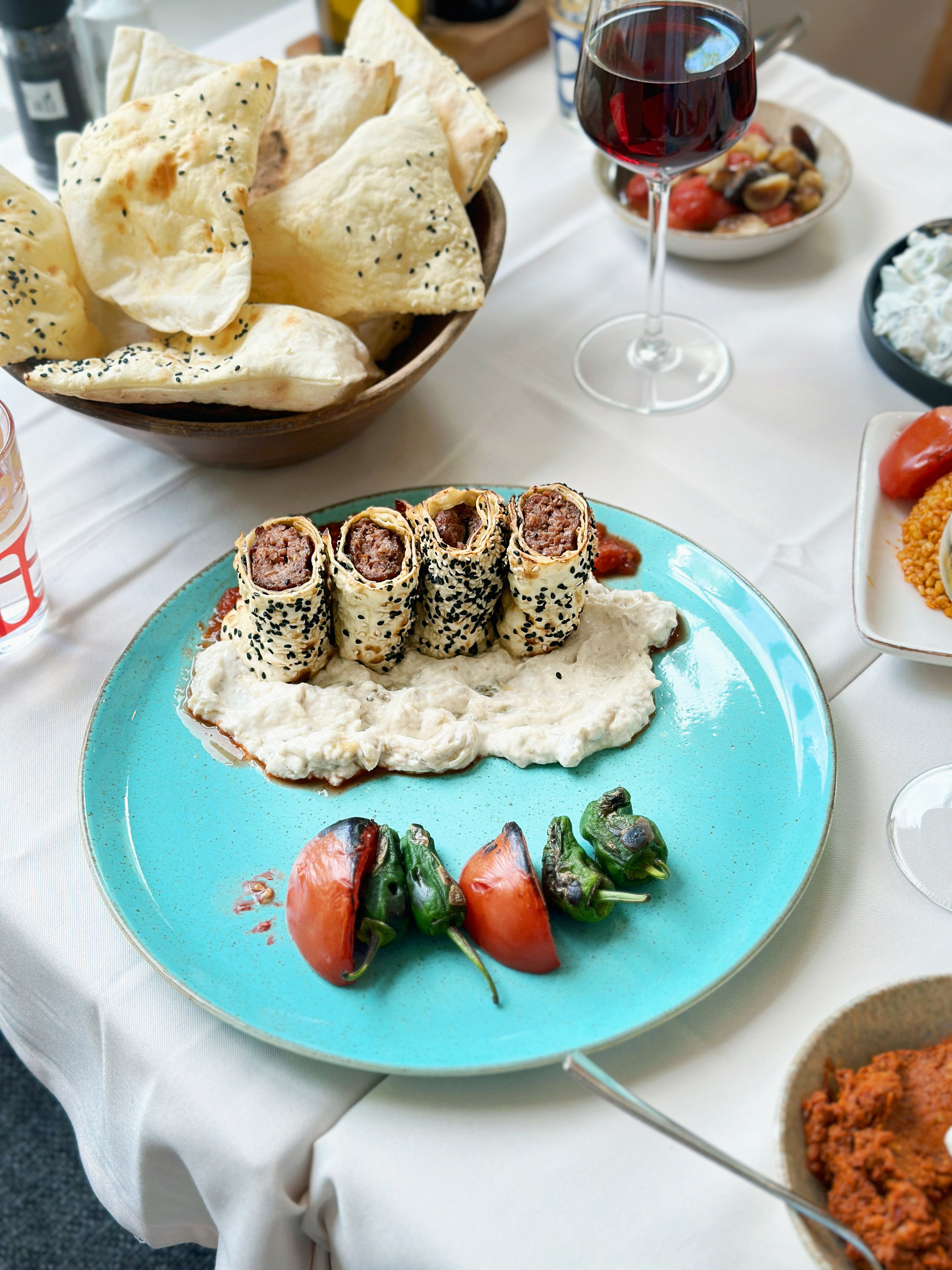 Gevrek — lamb wrapped in flatbread, served with roasted eggplant puree with yoghurt and tomato-garlic sauce