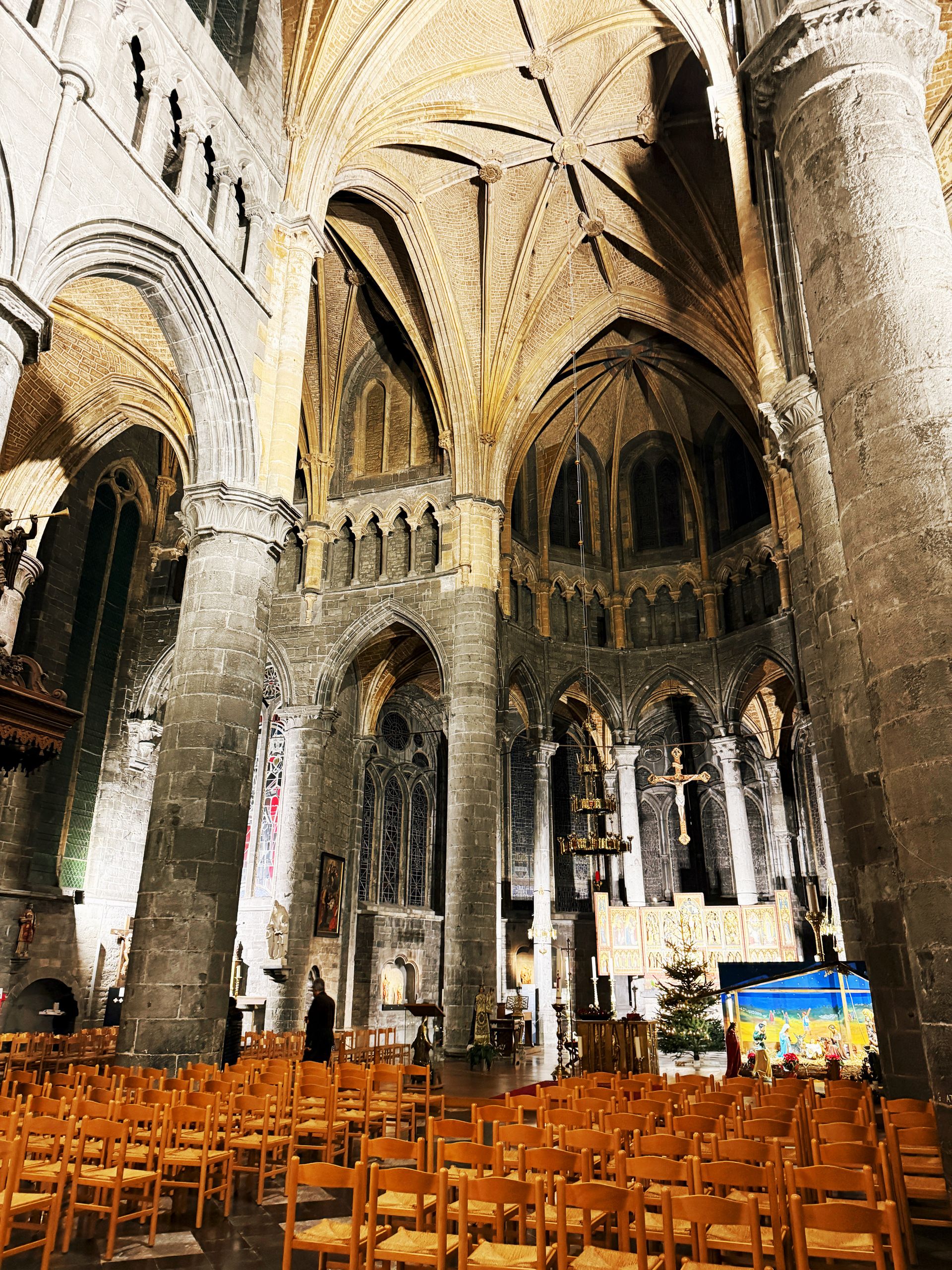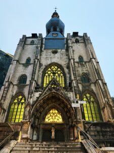 The church was built using local limestone and showcases the Gothic Mosan style. Inside, it has three naves, tall arches, and columns that give the space a sense of elegance and calm. The building site is small due to the rocky cliff behind it, but the design creates an impression of openness and majesty. The stained glass windows, including one of the largest in Europe, fill the interior with beautiful colors.