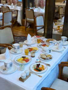 Mornings begin in the “Normandy” breakfast room, inspired by the legendary ocean liner Normandie, a tribute imagined by the second generation of the Cravat family, bringing the elegance of sea travel onto land.