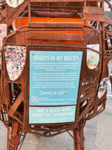 Henry’s design reflects the harsh reality of water pollution. Cormorants, like many aquatic animals, often mistake plastic for food, leading to devastating consequences. As a symbol of change, Henry’s feathers are gradually being added, each made from plastic waste fished directly from the canal and recycled by the Plastic Factory.