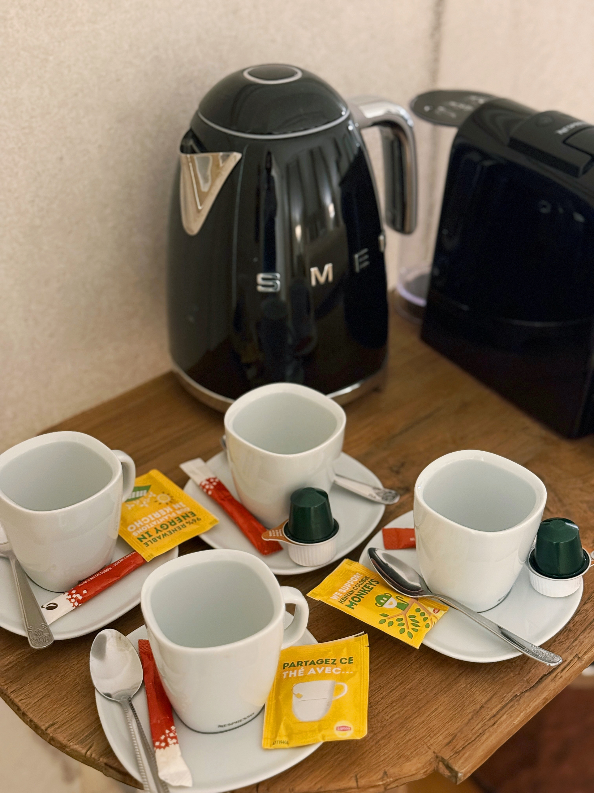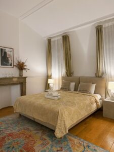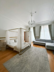 The rooms are luxuriously appointed with spacious layouts, high ceilings, and an abundance of natural light. Some rooms feature private balconies or terraces, offering picturesque views. Each room boasts a unique design, with elegant furnishings and modern comforts, including a coffee machine, tea kettle, and refrigerator.