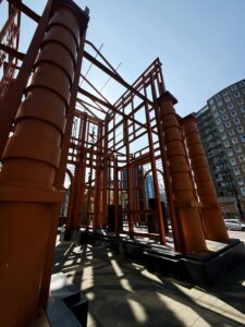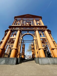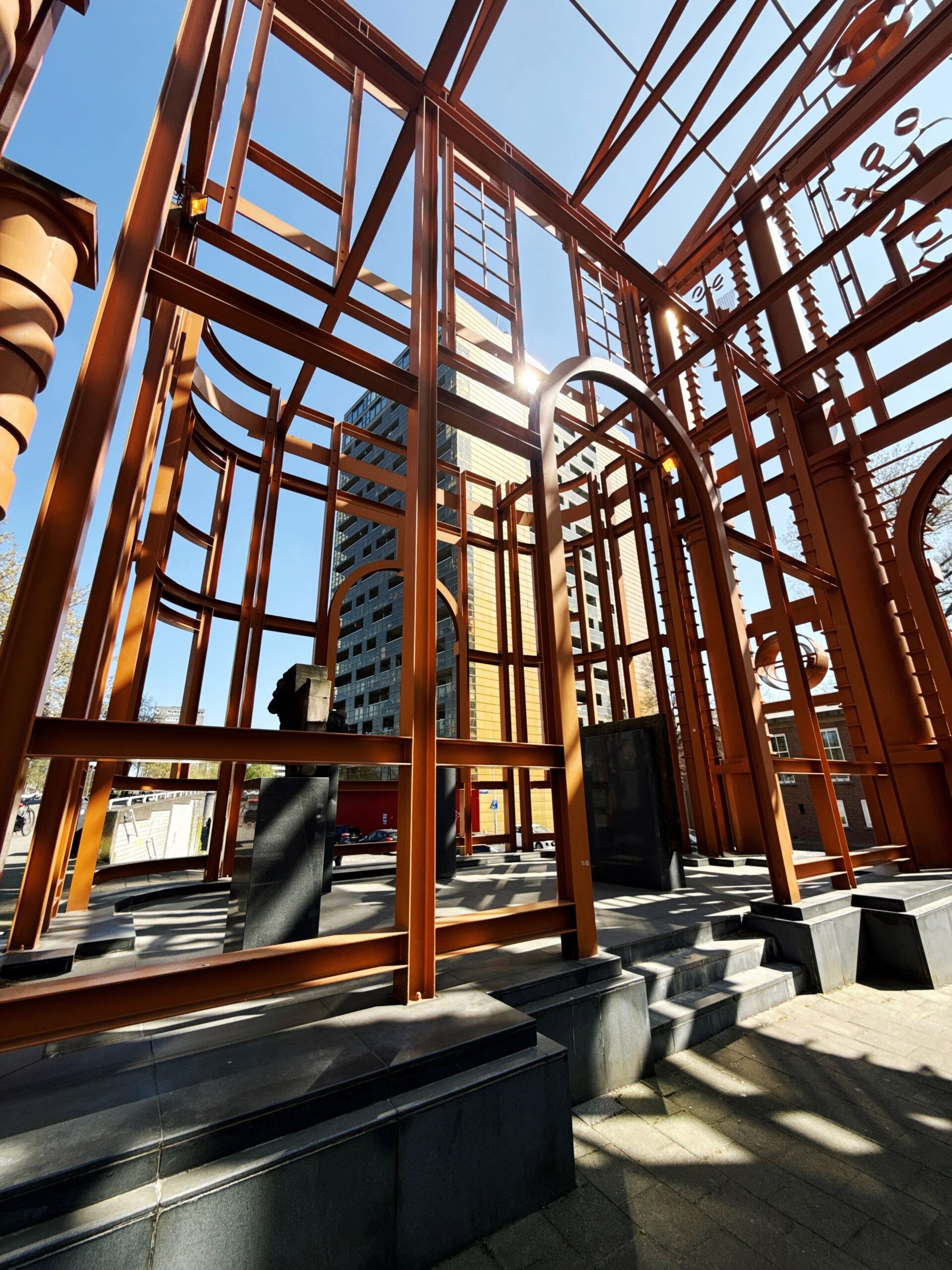 Just steps from Rotterdam Central Station stands the Nieuwe Delftse Poort. It’s not a traditional city gate, but a striking steel skeleton that captures both memory and movement. Artist Cor Kraat unveiled this 18-meter-high orange structure in 1995 to honor a lost landmark and celebrate 50 years of post-war rebuilding.