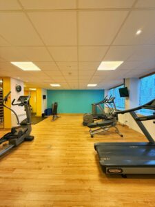 The fitness center, equipped with modern training machines, ensures you can maintain your workout routine during your stay.