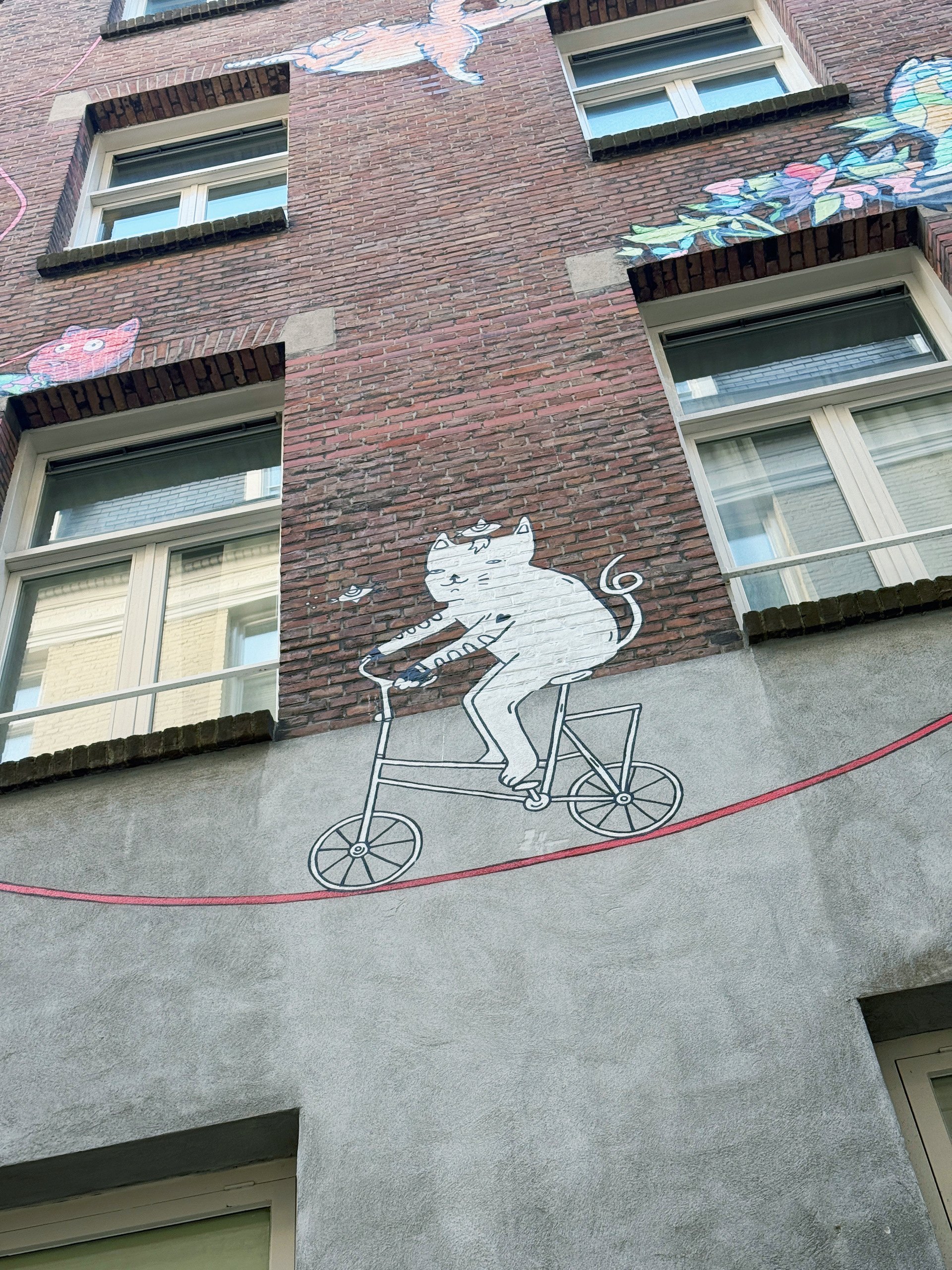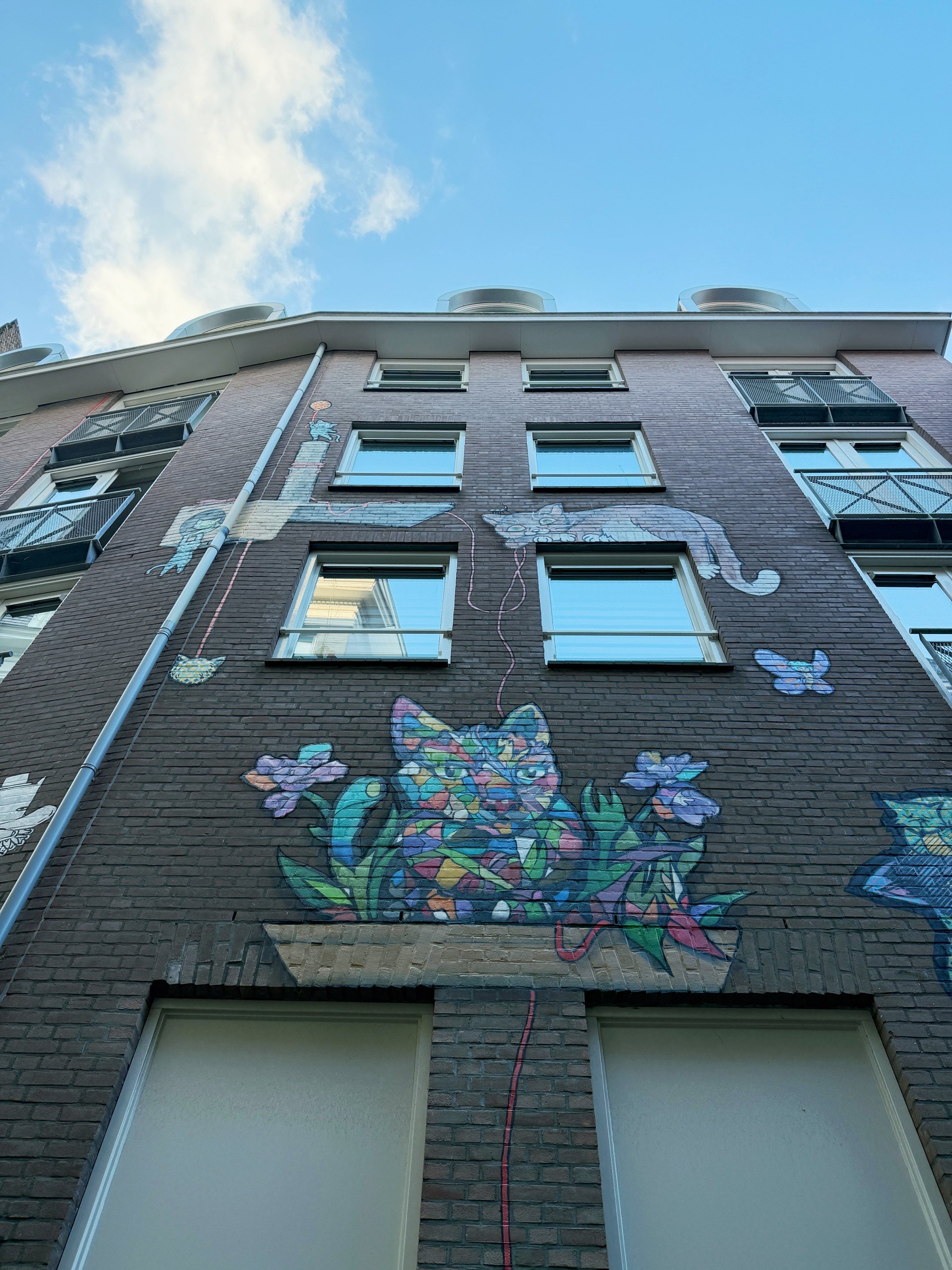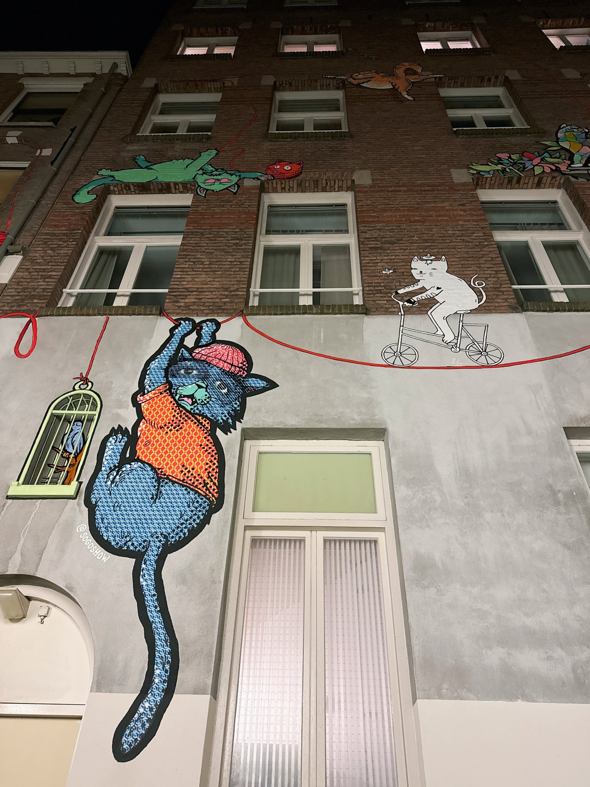 There are 17 cats in total on the walls, each with its own personality and story. The artists included many charming details: playful kittens, a tiny rat, and even a downspout that was cleverly transformed into a cat scratching post.